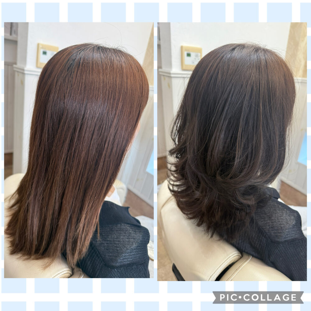 同窓会があるから♡ と少しイメチェンをされたお客様 毛先は15センチぐらいカットして ゆるーくパーマをかけました カラーは前回よりも少し明るめのオレンジブラウンで優しい雰囲気になりました♪ 同窓会どうでしたかー?
