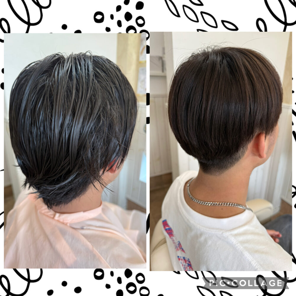 カラーカットで御来店です 伸ばされてましたが 切る!!との事で カッコイイショートスタイルに♡ サイド、襟足はしっかり刈り上げてます 毛量が多くて広がりやすい髪質なので ポイントで縮毛矯正されてるので扱いやすいです