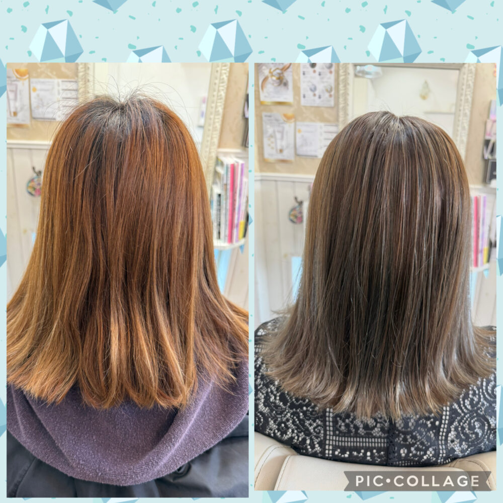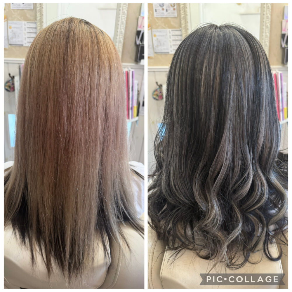 カラーでご来店です 髪がキレイに見える事が第1条件なので 今回もブリーチ無しで透明感のあるカラーにしました♡ クイック髪質改善トリートメントをしたら 御来店時よりも髪が長くなった!! と うねりが無くなったのを喜んでいただけました♪